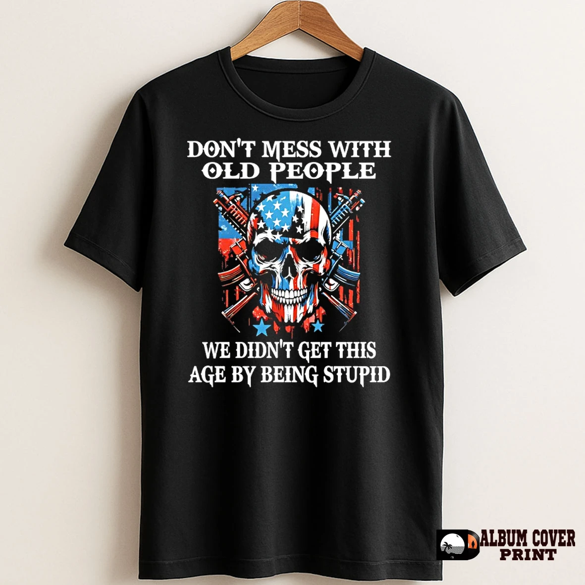 I jumped, startled. A man, maybe seventy, with a twinkle in his eye, was pointing at my chest. “That skull with the gun? Classic! ‘Don’t mess with old people’? Preach! We’ve seen things, you know?”
